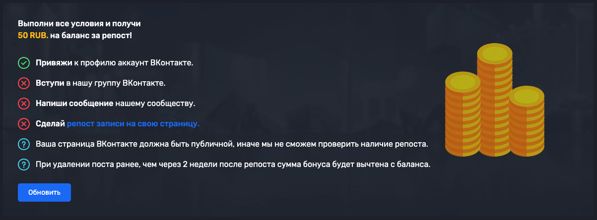 Для получения бездепозитного бонуса 50 рублей в Brillx Casino достаточно сделать репост в официальной группе казино и не удалять его в течении 2х недель. Деньги начисляются мгновенно.